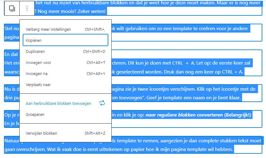Nu is de hele pagina geselecteerd. Bovenaan de pagina zie je twee icoontjes verschijnen. Klik op het icoontje met de drie puntjes en kies voor: “Aan herbruikbare blokken toevoegen”. Geef je template een naam en je bent klaar.