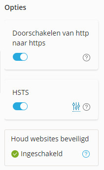 Aan de linkerkant van de pagina zie je het onderdeel opties staan. Zorg dat je HSTS aan hebt staan. Dit zorgt er voor dat je gebruikers forceert om een HTTPS verbinding op te bouwen.